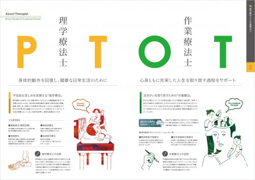 写真を使わず、ユーモアとヒネリの効いたオリジナルイラストでリハビリを表現。