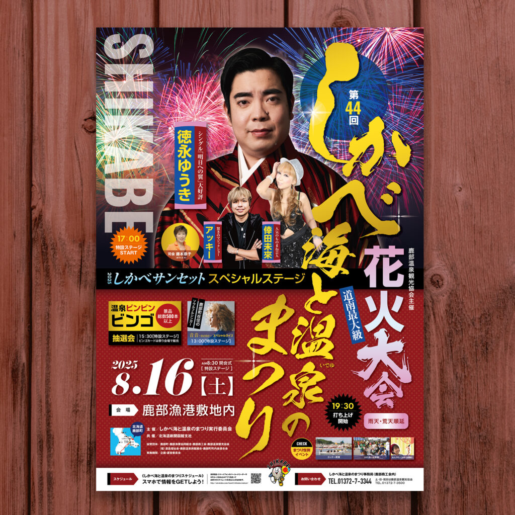 夏の恒例、鹿部町の祭りを告知するポスターです。祭りのメインイベントは今年から名称が変わった「しかべサンセットスペシャルステージ」と「花火大会」。盛大な花火をバックに豪華な出演者のポートレートが並ぶ構図となっています。タイトル文字には迫力ある筆文字を採用していますが、北国の祭りの高揚感を喚起すべく大胆な「たすき掛け」のレイアウトで配置してみました。