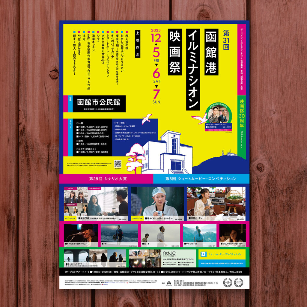 今年で30周年となるイルミナシオン映画祭は日本映画中心のプログラムで、大手配給会社が取り上げない、小規模ながら優れた作品を3日間に渡り上映しています。今年から会場が函館山ロープウェイ・クレモナホールから、函館山麓の函館市公民館に完全移行しましたが、ポスターはそれを象徴する風景をイラスト化し、上映作品のスチール写真とポップな色彩でまとめています。映画祭ではシナリオ大賞やショートムービーコンペティションなど映画人の発掘にも力を入れています。