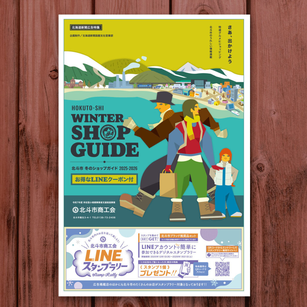 北海道新聞の広告特集として函館市・北斗市全域に掲載された「北斗市冬のショップガイド」です。B3・2折りの大判チラシの仕様となっております。誌面には飲食店をはじめとした北斗市の厳選ショップを掲載しており、各店、本誌限定のお得なLINEクーポンのQRコードも配置しています。表紙には北斗市の遠景をバックに、冬の装いでショッピングを楽しむアクティブな親子の姿を描いたオリジナルイラストを配置しました。関連企画のLINEスタンプラリーの情報も掲載しています。