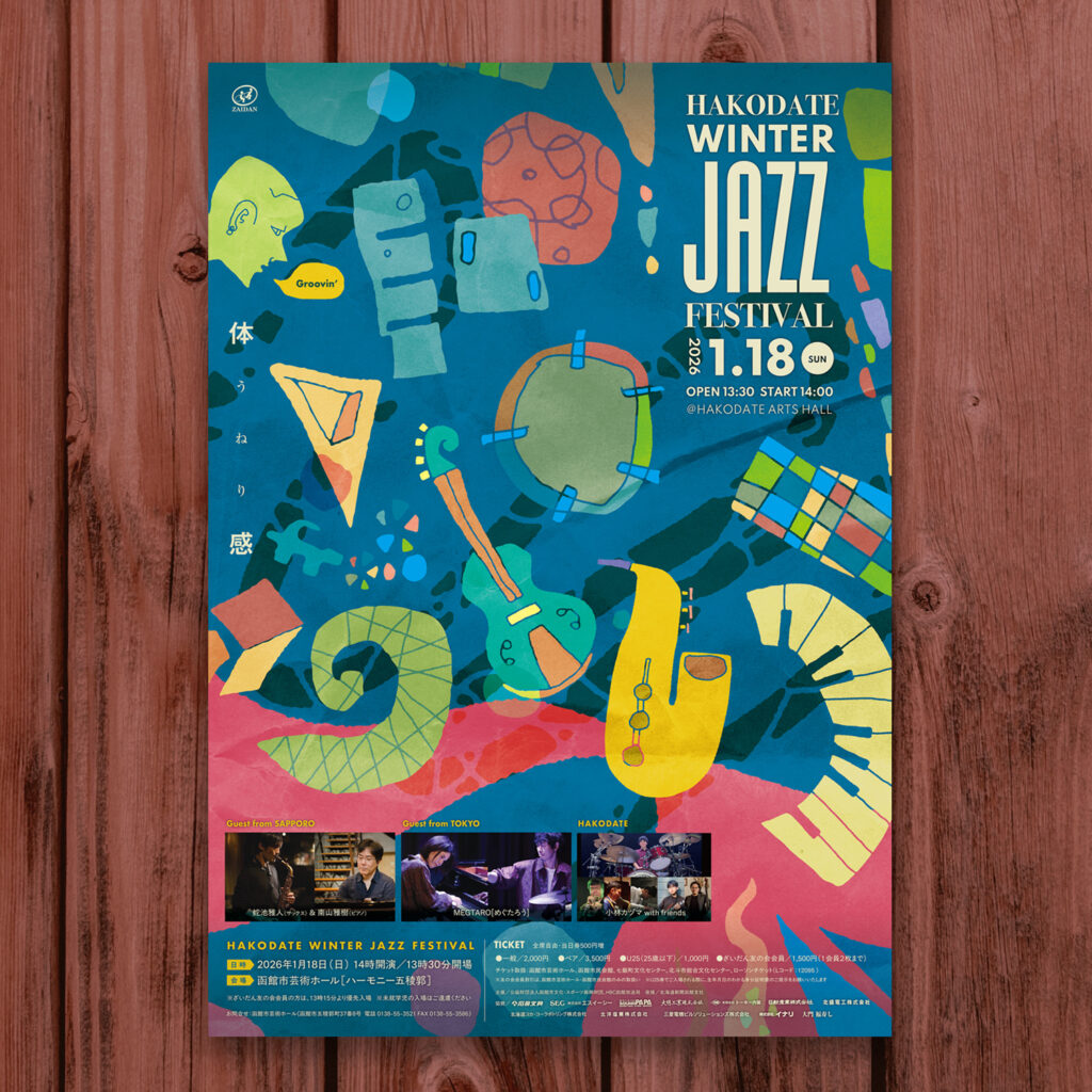 HAKODATE WINTER JAZZ FESTIVALのポスターデザインです。こちらも毎年、コンセプトや出演者のジャンルに合わせてアートワークをご提案しています。今回のテーマは「Groovin’」でした。ステージと観客が一体となり、次第に会場がひとつの「うねり=グルーヴ」を生み出す瞬間の動きを表現してみました。