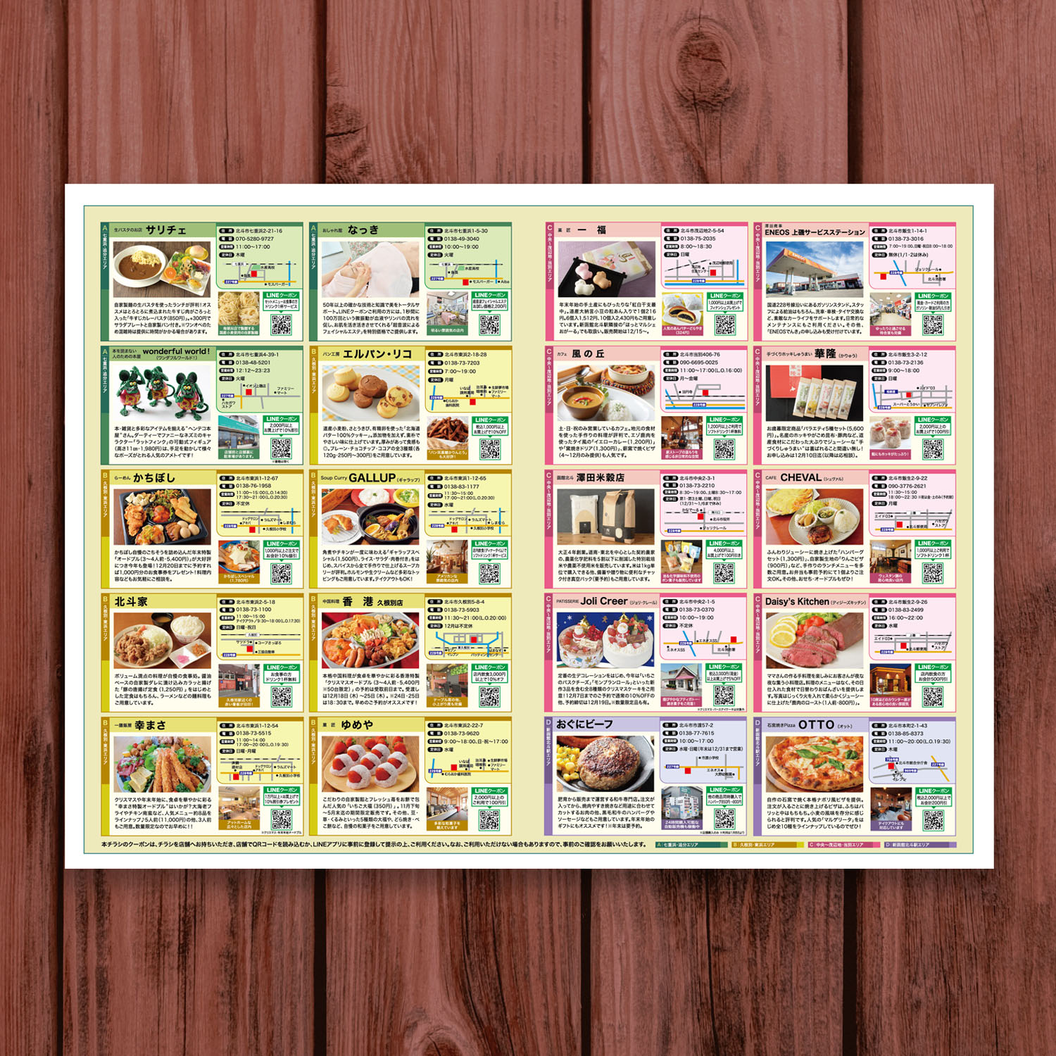 中面は広い北斗市を4つの地域に分けて色分けし、各店の基本情報といまイチオシの商品を紹介しています。各店舗の取材と文章作成、プロカメラマンによる写真撮影も弊社で手配し、LINEクーポンのサイト整備もお手伝いいたしました。お得なイベント企画や商工会加盟店の情報などは北斗市商工会のウェブサイトをご覧ください。